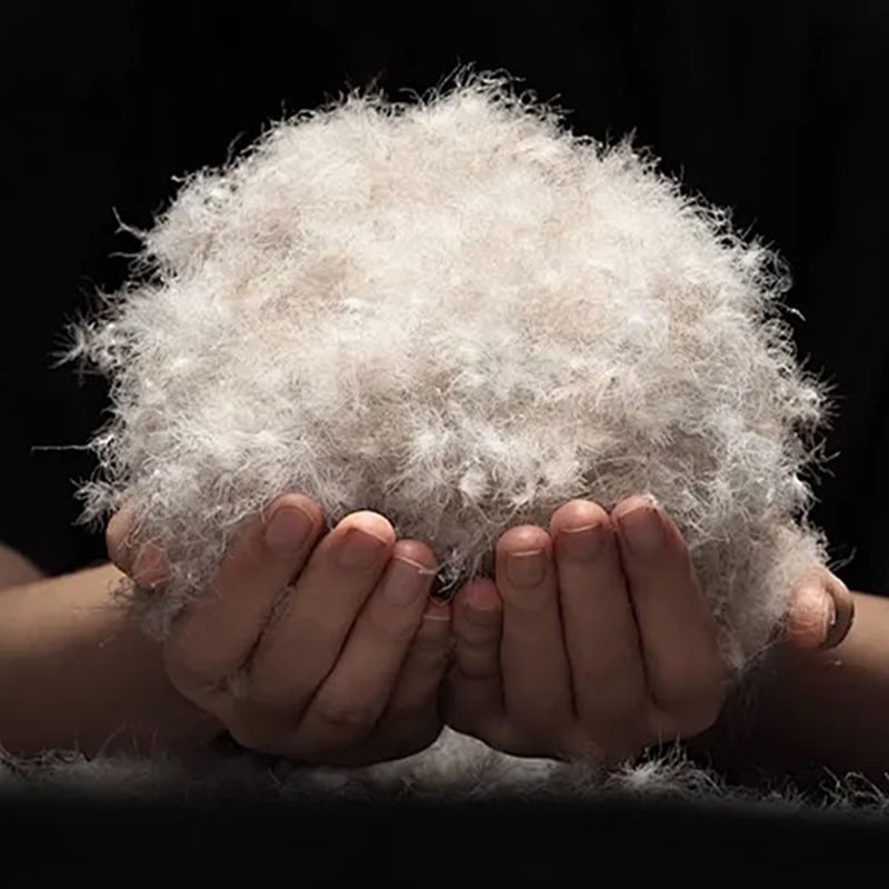 Основные пуховые области брюшка и шеи серых уток тщательно отбираются, и используется научный процесс соотношения, чтобы объединить 50% серого утиного пуха высокой плотности и 50% высококачественных перьевых волокон для формирования естественной теплой композитной структуры. Пух имеет форму трехмерного скопления камыша, а поверхность каждого пуха плотно покрыта точной треугольной сеткой пор для создания динамической системы микроциркуляции с контролем температуры: когда холодно, волокно естественным образом скручивается, образуя воздушный изоляционный слой, а когда жарко, волокно растягивается, способствуя отводу влаги, достигая двойного интеллектуального регулирования температуры и влажности. Уникальная структура из полого волокна может эффективно поглощать тепло, излучаемое человеческим телом, образуя при этом естественный теплоизоляционный барьер, эффективно блокируя вторжение внешних холодных потоков и обеспечивая нужный свет и тепло.
